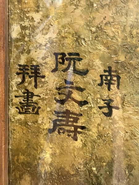 Après un examen approfondi, nous souhaitons apporter une précision : il s’agit d’une peinture à l’huile réalisée directement sur toile, et non sur soie marouflée sur toile comme initialement indiqué. Quant à l’effet doré, le fond de l’œuvre est sublimé par des paillettes métalliques évoquant un éclat d’or, et non par feuille d’or appliquée comme dans les laques traditionnelles.