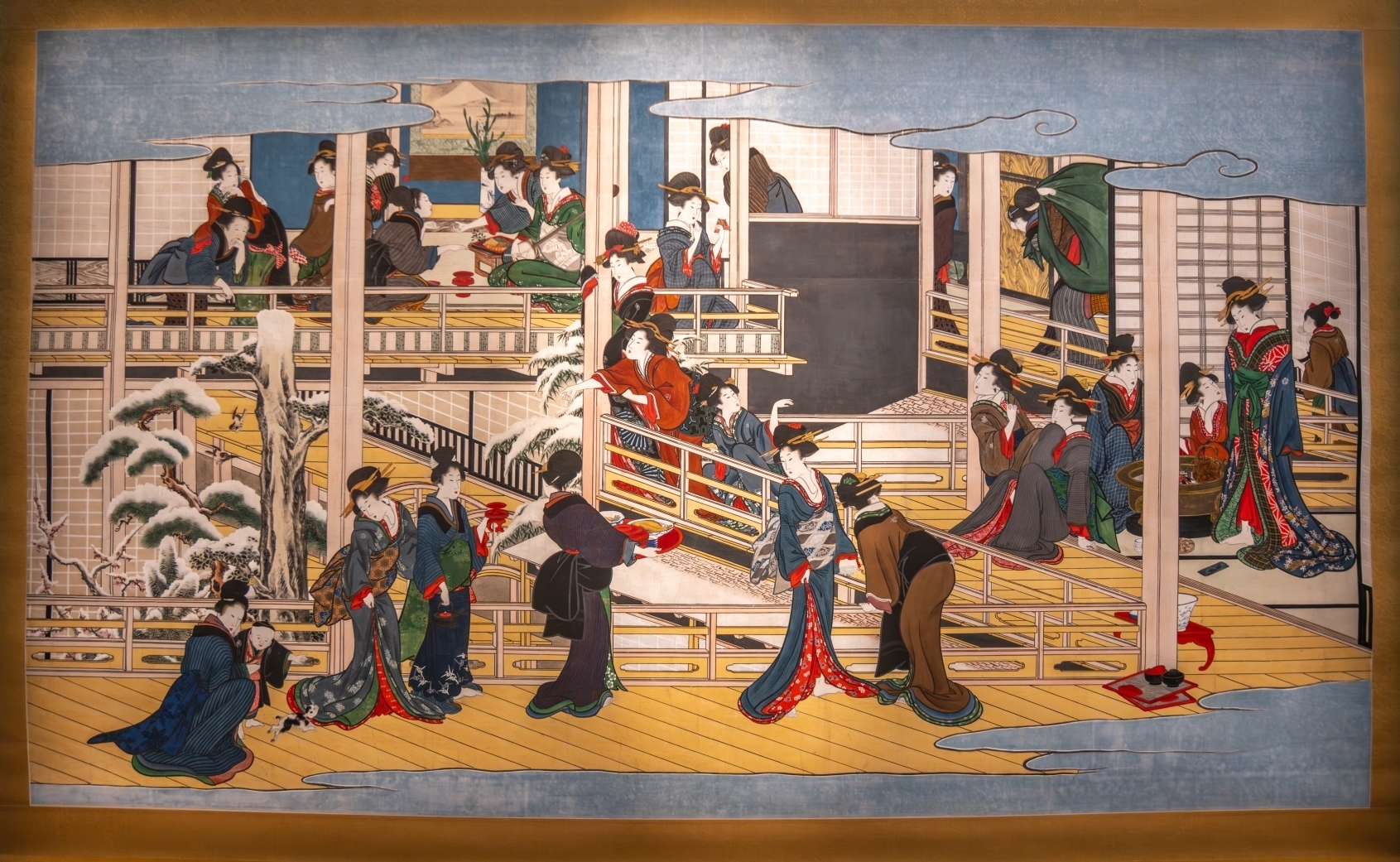 Với chiều rộng hơn ba mét, bức tranh được xếp vào một trong những bức tranh lớn nhất từ thời Edo. Người ta tin rằng nó được một thương gia giàu có ở Tochigi đặt làm, đây là tác phẩm duy nhất còn sót lại ở Nhật Bản từ bộ ba tranh nổi tiếng của Utamaro, Tuyết, Trăng và Hoa . Hai tác phẩm còn lại – Trăng ở Shinagawa và Hoa anh đào ở Yoshiwara – được lưu giữ trong các bộ sưu tập của bảo tàng Hoa Kỳ.