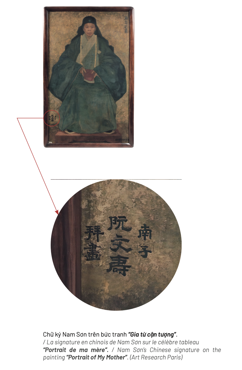 Trên bức tranh danh tiếng “Gia từ cận tượng” (Chân dung mẹ tôi), Nam Sơn ký bên góc trái, phía dưới: