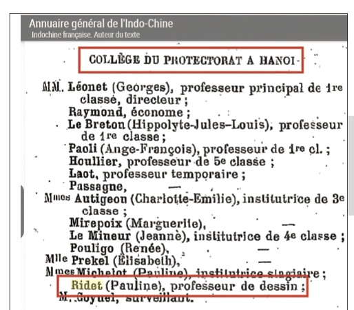 Theo những dữ liệu tìm kiếm được trong sổ Niên giám [2] tại Hà Nội vào thời kỳ thập niên 1910, chúng tôi tìm được một cô giáo có họ là Ridet, tên Pauline, sinh ngày 1/6/1867, Huân chương giáo dục (hạng Officier), giáo viên cấp bậc 1, nhậm chức trong chính quyền Đông Dương ngày 1/5/1902. Điều đáng lưu ý ở đây, cô giáo Ridet là giáo viên biệt phái của trường Bách Nghệ Hà Nội, là một ngôi trường có liên quan đến nghệ thuật 25. Rất có thể đây là cô giáo dạy vẽ của Nguyễn Nam Sơn.